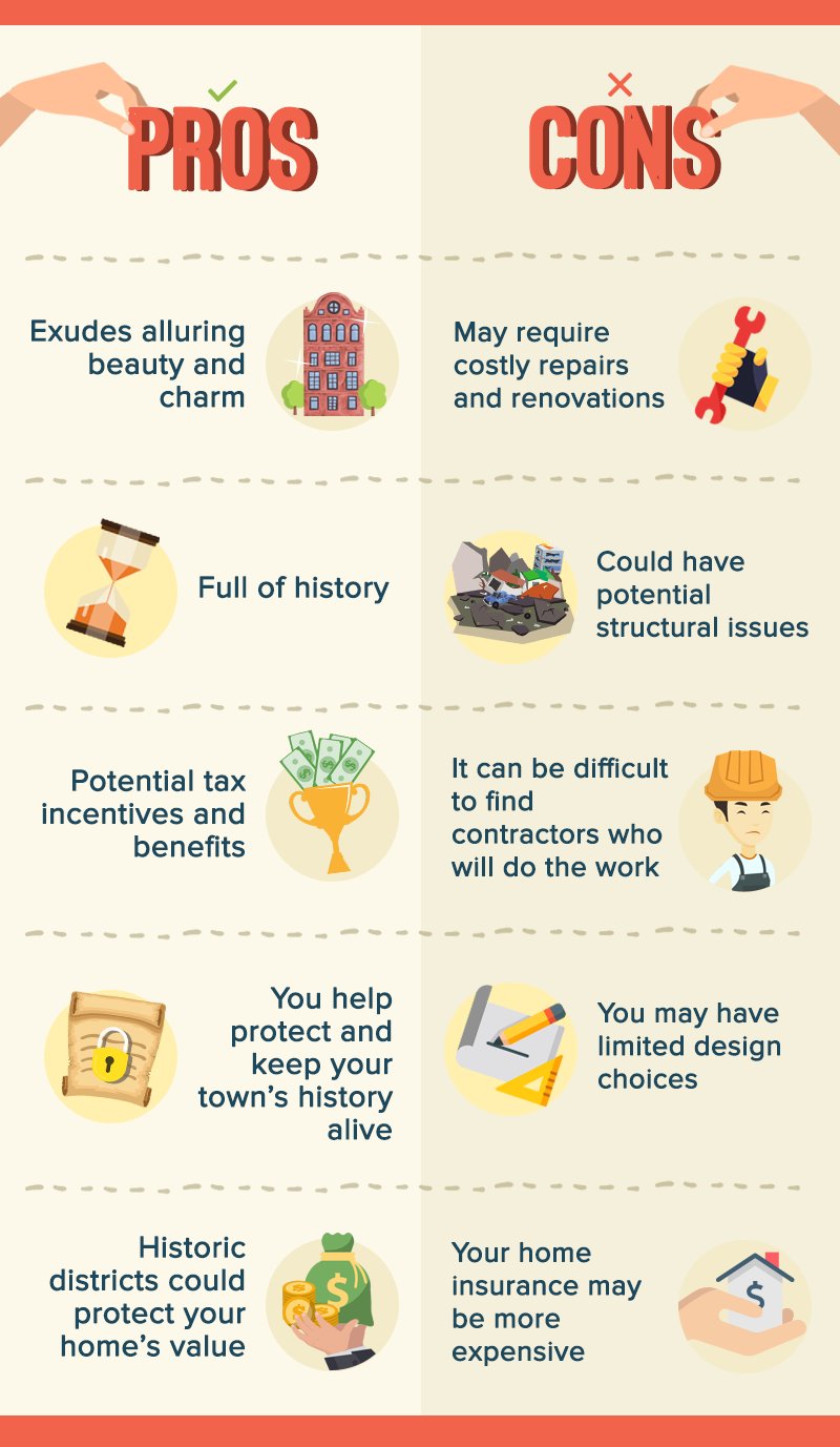 Owning a historic home certainly comes with its own set of benefits and challenges. You need to make sure that you are ready for the challenges and responsibilities—financially, emotionally and even physically. Beyond its unique and charming characteristics, it is also important to determine whether the home meets your lifestyle and certain life choices. Historic homes often close at higher sale prices because of their historical value, and many of these are in high demand in certain regions in the US. Once listings for historic homes become available, which only happens once in a while, you can be sure that there will be no shortage of buyers. **_What's the difference between an old house and a historic home?_** The [National Register of Historic Places](https://www.nps.gov/nr/), which is maintained by the National Park Service, gives historic homes their specific designation. Historic homes are included in an official list that differentiates them from an ordinary old home. These homes must also be at least 50 years old. They received their designation because of age, architectural style and value, cultural significance, or if they were once the residence of a historically significant person. There are now over 90,000 listed historic properties in the National Register since its inception in 1966. Another organization that lists historical homes and celebrates their diverse history is the [National Trust for Historic Preservation](https://savingplaces.org/). One of the most famous historic homes that is privately-owned is The Painted Ladies in San Francisco, California, which features an iconic row of historical Victorian homes. Meanwhile, the French Quarter in New Orleans remains as one of the most popular historic neighborhoods. Likewise, many famous historic homes now serve as museums and provide daily or weekly guided tours for locals and tourists alike. **Here are the pros and cons you need to weigh out before buying a historic home:** **PROS** **_1. Exudes alluring beauty and charm_** Have you always loved the feeling of going back in time? Historic homes will certainly transport you to a certain period or era through their stunning architectural styles and outstanding beauty and charm. This is true regardless of whatever style you love—Victorian, Colonial, a Queen Anne, or even a Gothic Revival. From ornate stone fireplaces, balustrades, bay windows, vintage door knockers, and even arched doorways, to sturdy gables, turrets, and towers, there are so many intricate details to love in a historic home. They are unlike many contemporary homes, which are less distinctive. Their unique charm simply can't be found in these modern properties. For many homeowners and enthusiasts, it may even take months or years before they notice all of the home’s striking features. Many historic homes also represent the best of a particular architectural style. Historic homes maintain their charm and durability despite enduring years of hardships. This is one of the reasons why these dwellings still exist today and haven’t lost their appeal. Those intricate details, as well as the high level of craftsmanship, are often enough for aspiring buyers to seriously consider owning a historic home. **_2. Overwhelming with history_** Historic homes boast not only of charming characteristics but also their own interesting history. Aspiring historians, history buffs, or any “old soul” will love living in a historic home because it will let you connect with the town’s past and the unique stories of the people who lived there. These houses play an integral part in their town’s history and heritage. **_3. Potential tax incentives and benefits_** There are certain tax incentives or tax deductions available to owners of historic homes. The Federal Historic Preservation Tax Incentives Program, for an instance, offers a 20 percent federal tax credit specifically for the historic preservation and rehabilitation of properties listed in the National Register and used for income-producing purposes. Aside from federal programs, many states and local governments also offer financial incentives in the form of tax credits to those who want to purchase and preserve them. Lower interest loans are also be available for renovation and preservation of historic homes that are otherwise not available to other homeowners. **Our modern tip:** Do your research to find out if you are eligible for any of these tax abatements and loans. While these incentives won’t make you rich, they can significantly improve your financial standing after owning a historic home. Check into all the possibilities for a local or regional grant. Similarly, don’t be afraid to reach out to current owners of historic homes in your area to understand the local tax situation and potential financial grants. **_4. You help protect and keep your town’s history alive_** By purchasing a historic home and becoming an owner of a piece of history, you are helping to keep history alive. Even if you make the home your own by renovating its interior and keeping up with the necessary repairs and updates, you are preserving it while giving it a new life at the same time. Many homeowners believe that restoring these historic treasures brings more value that can’t be measured in money. It is because they are also helping other people, past owners and locals alike, to retain their connection to the home and its history. You are encouraging them to continue loving and honoring their heritage. Think of it as a humble and exemplary contribution to the preservation of an important aspect of history. For many history buffs, it can be a dream come true and accomplishing one of their life’s missions as well. **5. Historic districts can protect your home’s value** If you’re the type of homeowner who has always been disappointed by your neighbor’s decision to paint his/her house in hideous colors or make any unsightly additions, then you must have longed for