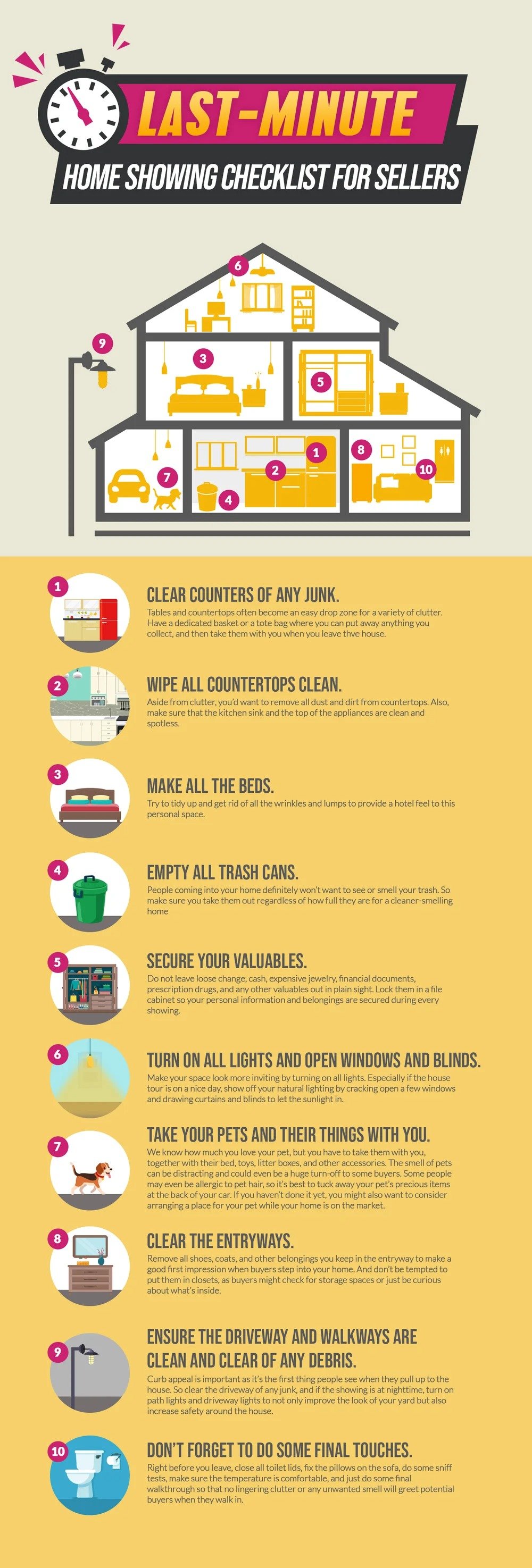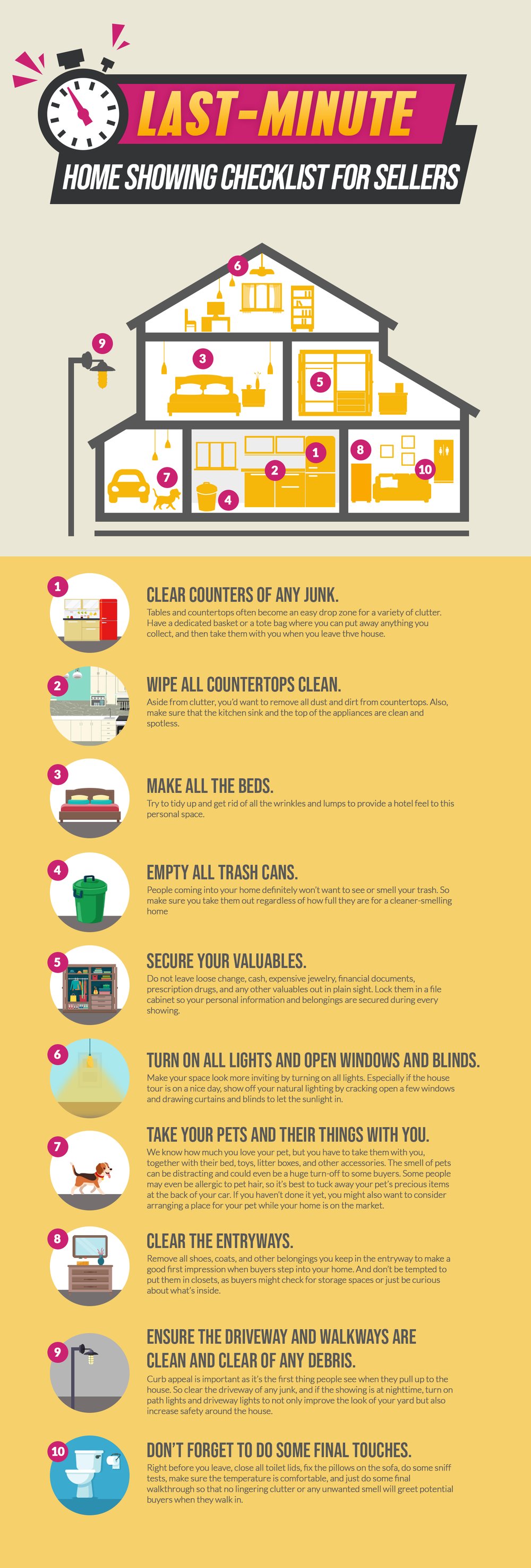 Now, all you need is a simple checklist just in case you get a call from your REALTOR® that a buyer wants to see your house in an hour… or less. Here are a couple of tasks you can do to further make a good impression and lessen the stress of every single home showing.
