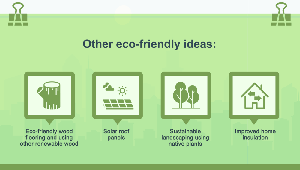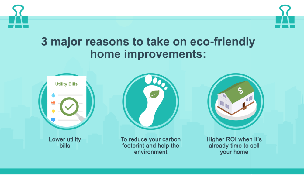 HomeownerSeller September 12, 2018 **Whether you are a homeowner planning a major remodel or a seller preparing to put their home on the market, an important factor you have to consider is the products and materials you will use. This time, why not try to become more environmentally conscious when remodeling your home?** You can incorporate eco-friendly and energy-efficient products into your home renovation ideas, especially those green solutions that are easily available and affordable. One benefit is that there are certain [tax incentives for homeowners](https://www.realtor.com/advice/finance/tax-benefits-of-owning-a-home/) who installed alternative energy upgrades, stated in the Residential Energy Efficient Property Credit. According to the [REALTORS® and Sustainability 2018 Report](https://www.nar.realtor/research-and-statistics/research-reports/realtors-and-sustainability) by the National Association of REALTORS® Research (NAR) Group, 71% of respondents said energy efficiency promotion in listings was very or somewhat valuable. Many MLS has green data fields that real estate agents typically use to promote green features, energy information, and green certifications. Likewise, 56% of these REALTORS® find that clients are at least somewhat interested in sustainability. **Here are the major reasons to take on eco-friendly home improvements**:  1. **Lower utility bills -** In the same report, 28% of REALTORS believe a home's utility bills and operating costs is one of the home features that are most important to their clients. Energy-efficient upgrades can help reduce your water and energy bills — a significant return on investment that any homeowner will appreciate. 2. **To reduce your carbon footprint and help the environment -** Tackling these environmentally friendly projects promotes healthy living for you and your family, while helping to save the planet. 3. **Higher ROI when it’s already time to sell your home -** Eco-friendly home improvements, especially in the kitchen and bathroom, add value to the home itself. They will be more prominent when it’s time to put your home on the market. Likewise, for buyers who are interested in an energy-efficient home, they can connect to a lender who provides lending products that encourage energy efficient improvements to existing homes. Yes, there’s more you can do as a homeowner aside from using LED bulbs for your lighting fixtures. Here are some of those green home improvement projects that are relatively low-cost and easy to add or install:  ### **_1. Using low-VOC paint for better air quality_** Adding a fresh coat of paint to any room is a surefire way to transform it and make it look new. It's also one of the minor fixes that home sellers can do before listing their home for sale. However, many paints contain high levels of volatile organic compounds (VOC), which can cause several respiratory problems and contribute to ozone pollution. So next time you want to apply a fresh coat of paint to renovate a room, opt for low-VOC or non-VOC paints. These are water-based paints that are generally more environment-friendly than oil-based paints with high VOC content. You will end up with a room that looks not only fresh but also has better air quality. ### **_2. Installing water-saving fixtures and appliances_** Whether you are planning a kitchen or a bathroom remodel, it’s a good idea to replace your regular fixtures and appliances with their water-saving counterparts. Installing low-flow fixtures and appliances like faucets, shower heads, dishwasher, and even high-efficiency toilets, can help lower your water consumption. It’s a great way to conserve water without compromising your daily usage and comfort. Eventually, it can offer big savings in your wallet by trimming your water bills — an advantage that you and the future owner of the home can both enjoy. Toilets, for example, account for nearly 30 percent of an average home’s indoor consumption. Switching your older, inefficient toilet with a low-flow model can lower your water bills by about $110 a year, according to the [Environmental Protection Agency](https://www.epa.gov/watersense/residential-toilets) (EPA). Think about it: you can save your wallet and the planet at the same time. ### **_3. Electric Tankless Water Heater_** Another great option you can add on your next bathroom remodel is a tankless water heater, which is a great way to save water, money, and energy. Tankless water heaters either use gas or electricity and are generally more cost efficient. They heat water you only need to use in just seconds and there’s no need to wait for the water to heat up while wasting more water in the process. It’s another eco-friendly bathroom improvement that can add value to your home. ### **_4. Programmable, Smart Thermostat_** Compared to manual thermostats, this smart home technology is a great investment to help make a home more eco-friendly. Smart thermostats, such as the Nest Learning Thermostat, can help you save energy and lower your utility bills since you can control your heating and cooling needs. The technology will also allow you to program your temperature preferences on the areas where you need it most. You can set up these thermostats (through their mobile apps) to turn on when you wake up and turn off when you leave the house, contributing to bigger savings. ### **_5. Energy-efficient Windows_** Energy-efficient dual pane windows made from vinyl, metal or wood offer better insulation for your home compared to older, single-pane models. They can reduce your energy usage during both hot and cold climates, helping you save money while also lowering your environmental footprint. Double-paned windows also have great soundproofing qualities. They can significantly reduce outside noise, which can be a valuable investment if you live in the city or in a busy urban area and don’t want to wake up to the blaring car horns or sprinklers early in the morning.