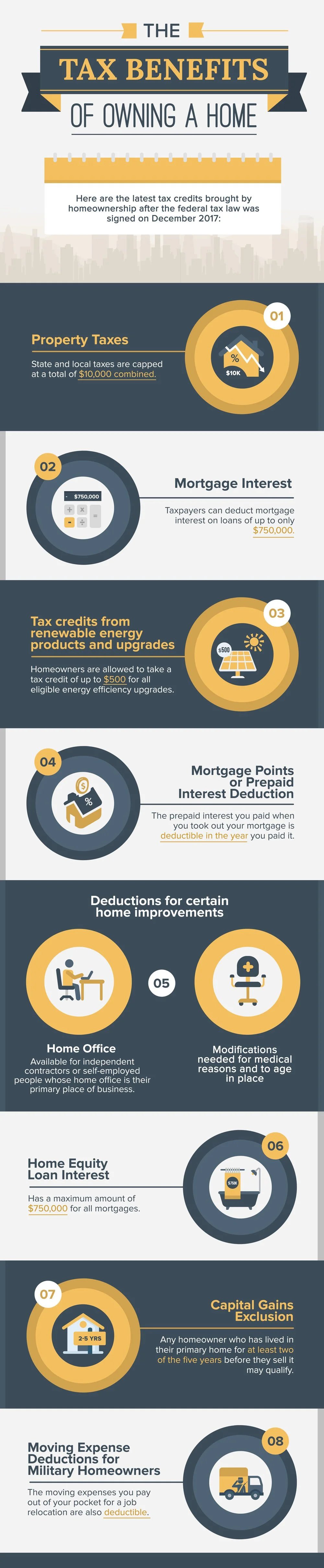 # The Tax Benefits That Homeowners Can Enjoy HomeownerBuyer September 05, 2018 **Is this your first year filing your taxes as a homeowner? If yes, then you're in for some sweet treats. There are certain deductions you are entitled to and can take advantage of to lower your tax bill. Some of these tax breaks can be a one-time deduction or recurring on the life of your mortgage.** For buyers who are still contemplating whether owning a home is worth it, this is another good reason that might help with your decision. Aside from building wealth through home equity, owning a home can pay off at tax time. And while itemizing tax deductions can be very complicated — homeowner or not — they are worth remembering so you can avoid missing out. Here are the latest tax credits brought by homeownership after the federal tax law was signed on December 2017:  ### **_1. Property Taxes_** Back in 2017, the deductions for property taxes were unlimited. All of your property taxes are deductible so if you live in an area where the property taxes are high, you could wind up deducting thousands of dollars. But for tax year 2018 and beyond, state and local taxes are capped at a total of $10,000 combined. This includes property, income, or sales taxes. Likewise, this tax deduction can still be helpful for your finances, although it can be tricky in the year you bought the home. You as the buyer and new homeowner will only get to deduct the property taxes you owed for the portion of the year you owned the home. The seller gets the rest of the deduction, regardless if you offered to pay the full year of property taxes during negotiations. ### **_2. Mortgage Interest_** Many homeowners can deduct the interest portion of their monthly mortgage payments each year. It remains as a deductible under the new tax plan but with a new cap. Taxpayers are now allowed to deduct mortgage interest on loans of up to only $750,000, compared to the previous $1 million. The maximum mortgage debt on which you can deduct the interest also applies to secondary or vacation homes. ### **_3. Tax credits from renewable energy products and upgrades_** Homeowners who have installed alternative energy upgrades in their homes may qualify for tax credits as long as the products installed are also eligible. Most of these deductions are still available through December 31, 2021, such as the credits for solar electric and solar water heating equipment. Homeowners are allowed to take a tax credit of up to $500 total for all energy efficiency upgrades. However, that $500 is already a lifetime limit for all qualified improvements combined. The products used must meet the ENERGY STAR requirements, which are certified to save energy, money, and help protect the environment. Upgrades may include installing energy-efficient windows, doors, skylights, and others. ### **_4. Mortgage Points or Prepaid Interest Deduction_** If you itemize your deductions on Schedule A of IRS Form 1040, the prepaid interest you paid when you took out your mortgage is deductible in the year you paid it. Paying the prepaid interest or points makes more sense if you plan to stay longer in your home as they can bring down the interest rate on your loan or help with origination fees. This is a one-time deduction that many homeowners can take advantage of — just remember that it is often deductible in the first year. Typically, a point is equal to 1 percent of your loan amount or $1000 for every hundred thousand borrowed. Tip: Mortgage points can be found on the Closing Disclosure and are often labeled as “loan costs.” The rules for this deduction will only differ if you refinance your mortgage to get a better rate or shorten the length of your mortgage, or to use the money for other things rather than for home improvements. If your situation falls under one of these conditions, you will need to deduct the points over the life of your loan. ### **_5. Deductions for certain home improvements_** - **Home Office** If you are using a part of your home regularly and exclusively for business, you may qualify for some tax breaks. With the new tax law, the home office deduction remains available for independent contractors or self-employed people whose home office is their primary place of business. However, if you're an employee who has an office to go to but occasionally works from home, this deduction has been repealed. - **Modifications needed for medical reasons and to age in place** For older homeowners who have medical concerns and plan to age in place, their home remodeling projects could involve modifications to support these needs. The projects may vary but could include installing wheelchair ramps, non-skid floorings, adding stair lifts, widening doorways, and even putting grab bars, shower seats, and anti-slip coating in bathrooms. The good news is that the cost of these modifications can be deductible. However, there are specific conditions for you to qualify for this sweet tax break. For an instance, you will need a letter from your doctor that will certify these improvements were medically necessary. The modifications also need to exceed at least 7.5% of your adjusted gross income. ### **_6. Home Equity Loan Interest_** Home equity loans or HELOC allow you to get a tax break on the interest you pay. However, the deductible is applicable only if you’re planning to use it for major home improvements, like remodeling a bathroom or renovating a fixer-upper. It also has a maximum amount for all mortgages, which is $750,000. The tax benefits of this credit will be most significant to any homeowner for the first years of the loan since most of the payments are going towards interest. ### **_7. Capital Gains Exclusion_** Any homeowner who has lived in their primary residence for at least two of the five years before they sell it may qualify for this tax break. The IRS may exempt up to $250,000 if you’re single, or $500,000 if you’re married filing jointly, of that g