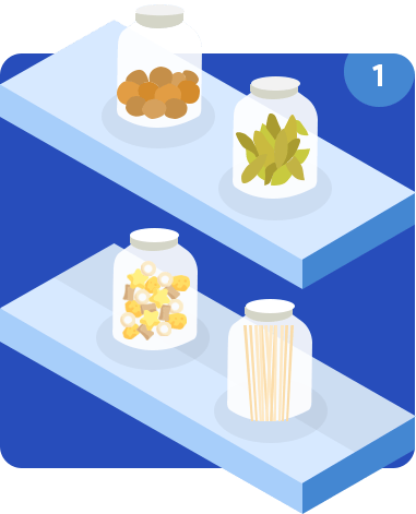 Just choose the essential items to transfer into large, clear containers, such as rice or pasta, so you can better keep stock of your inventory. Other items, such as snack foods, are better left in their original packaging to be arranged in baskets. Just eliminate their outer box to save more room in your storage.