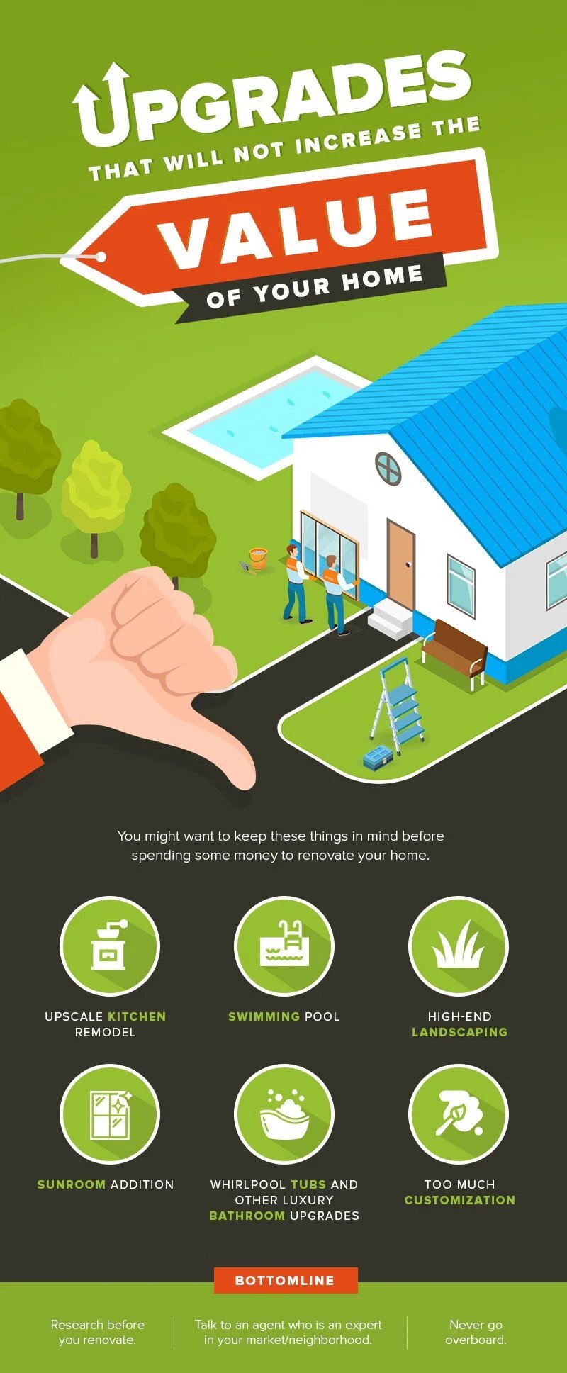 ### **_Part 3 of Everything You Need To Know About Your Home's Value series_** * * * **Here are home improvement projects that may not increase the value of your property, and could even bring it down when it's time for you to sell. You might want to keep these things in mind before spending some money to renovate your home.**  ### **Upscale kitchen remodel**  A high-end kitchen might be the ultimate gift for any home chef. Especially after several months of isolation, our kitchens might have become our comfort place. But if you think upgrading your kitchen to a “gourmet” status with a commercial stove, marble countertops, and high-end appliances will automatically increase its resale value, you might be in for a surprise. According to Remodeling magazine's 2020 Cost vs. Value report, an upscale kitchen renovation recoups just 54% of its cost in added value. So think twice before upgrading your space into a fancy, restaurant-style kitchen whose style doesn’t fit in with the rest of the house, or the neighborhood. This kind of kitchen remodel might even deter potential buyers. Focus instead on small kitchen upgrades that could yield a bigger payoff. ### **Swimming pool**  It's a dream come true to lounge by the pool, cocktails in hand, in the comforts of your own backyard. But while you can’t put a price tag on how much joy a swimming pool will add to your home and quality of life, you might want to think twice before considering this update. According to HouseLogic, installing an in-ground pool might only make more financial sense if you live in a state with a year-round hot or warm climate, or if you live in a higher-end neighborhood where most homes have pools. Your home’s value could only increase by no more than 7% after the pool installation, and only in certain circumstances. Not to mention, pools are expensive to install, difficult and pricey to maintain, increase your energy costs, and could even raise your homeowner’s insurance. And since a pool could also pose as a hazard, it might be a turn-off for buyers with small children. With its very minor potential value increase, a swimming pool addition may simply not be worth it. ### **High-end landscaping**  There's no doubt that landscaping can dramatically improve the curb appeal of a home. However, investing in expensive landscaping and going over the top to create what could be a backyard paradise will not increase your home’s value. Rather, it will only increase the maintenance required for it, which could be a concern to potential buyers. If you plan to sell, the sad truth is you won’t recoup the cost of the high-end landscaping in the sale. Likewise, any fancy decorative additions you add to make your lawn more attractive may not match the buyers’ tastes. This is why it’s best to stick with keeping your garden beautiful but won’t require countless hours of work. Should you wish to add any decorative window boxes and other lawn enhancements, make sure that they can be easily removed. A well-kept lawn that is easy to maintain all-year round will certainly make a better impression than a backyard with upscale landscaping. ### **Sunroom addition**  Unless the homes in your neighborhood have sunrooms that will help you stay competitive when you decide to sell, a sunroom addition adds very little to your home's value. This project can cost anywhere from $30,000 to $70,000, making it one of the most expensive home upgrades. And yet, it has one of the lowest returns on investment, returning an average of only about 49% of money spent. So even if a sunroom can be a great space for you to enjoy the outdoors, think carefully about how often you will use it before deciding to do this costly upgrade. Also, remember that a sunroom can also raise your energy costs in the winter and summer since glass doesn’t provide insulation. ### **Whirlpool tubs and other luxury bathroom upgrades**  Similar to swimming pools, tubs and other upscale bathroom improvements are also a gamble. Hot tubs and whirlpool baths take up space, require constant maintenance, and may result in higher monthly energy bills. Plus, home buyers with younger children might consider a tub as a safety hazard as some of them are difficult to climb into. If a hot tub is one of your must-haves, consider a portable hot tub instead of a built-in one so you could potentially take it with you when you move, or the new homeowners can easily remove it whenever they want to. Also, you might want to consider a walk-in shower that many homeowners can use frequently and will appeal to a wider pool of buyers. Further, don't get carried away by luxury bathroom additions like waterfall showers and over-personalized finishes that may cater only to buyers with specific tastes. ### **Too much customization**  We all love to make our homes better and more enjoyable to live in. However, any over-personalized or drastic renovations can hurt your home's value. Quirky tiling, wallpaper, adding textures and bold paint to walls, and other customized features will not appeal to the broadest pool of buyers. Worst, they will see it only as a distraction or as an added expense, especially if they will have to spend time and money to remodel it. So steer clear of any upgrades that are so personal or so specific that they will not add any resale value and will turn home buyers away when it’s time for you to sell your home. ### **Bottom Line** - **Research before you renovate.** Before doing any renovations, you need to look at your neighborhood. Look at comparable homes for sale near you and make sure the improvements you're planning to make align with the norms of your neighborhood, especially since individual markets place different values on different home improvements. And since buyers will also look at the average price of a home in your area, remember to have almost the same features or else your property will be priced out of the expected range and you won’t get your money 